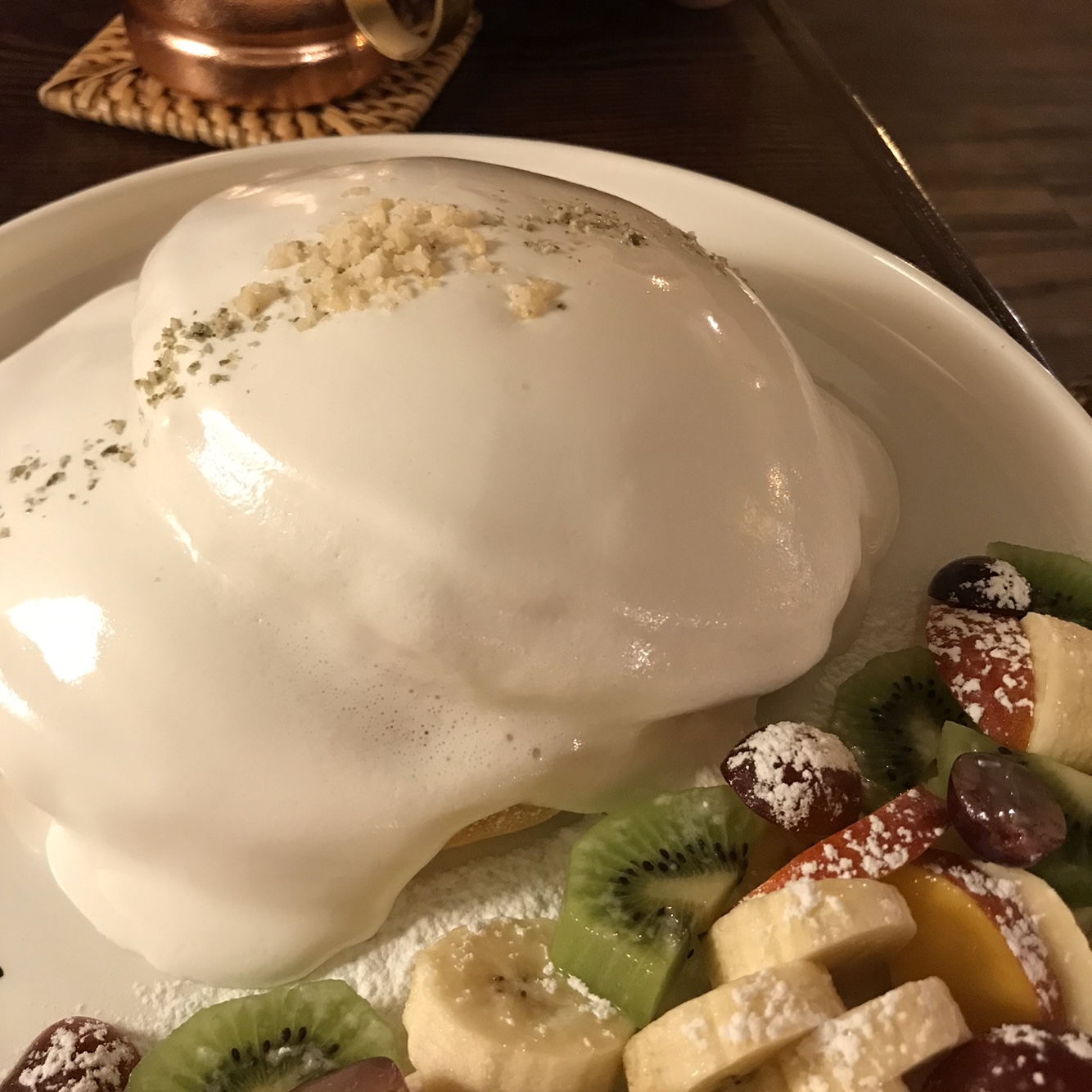 수플레 팬케이크가 아주 부드럽고, 생크림과 과일이 아주 잘 어울렸어요.