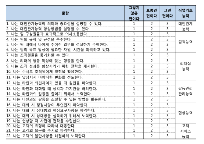 즉, 대인관계능력은 팀웍능력, 리더십 능력, 갈등관리 능력, 협상능력, 고객서비스 능력으로 구분하여