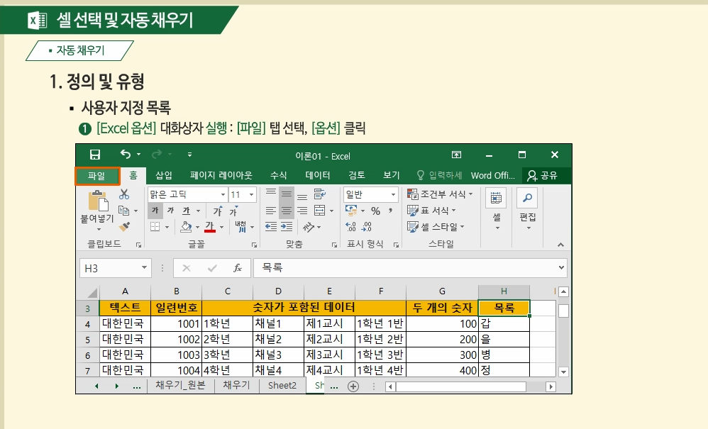 셀 선택 및 자동채우기 기능도