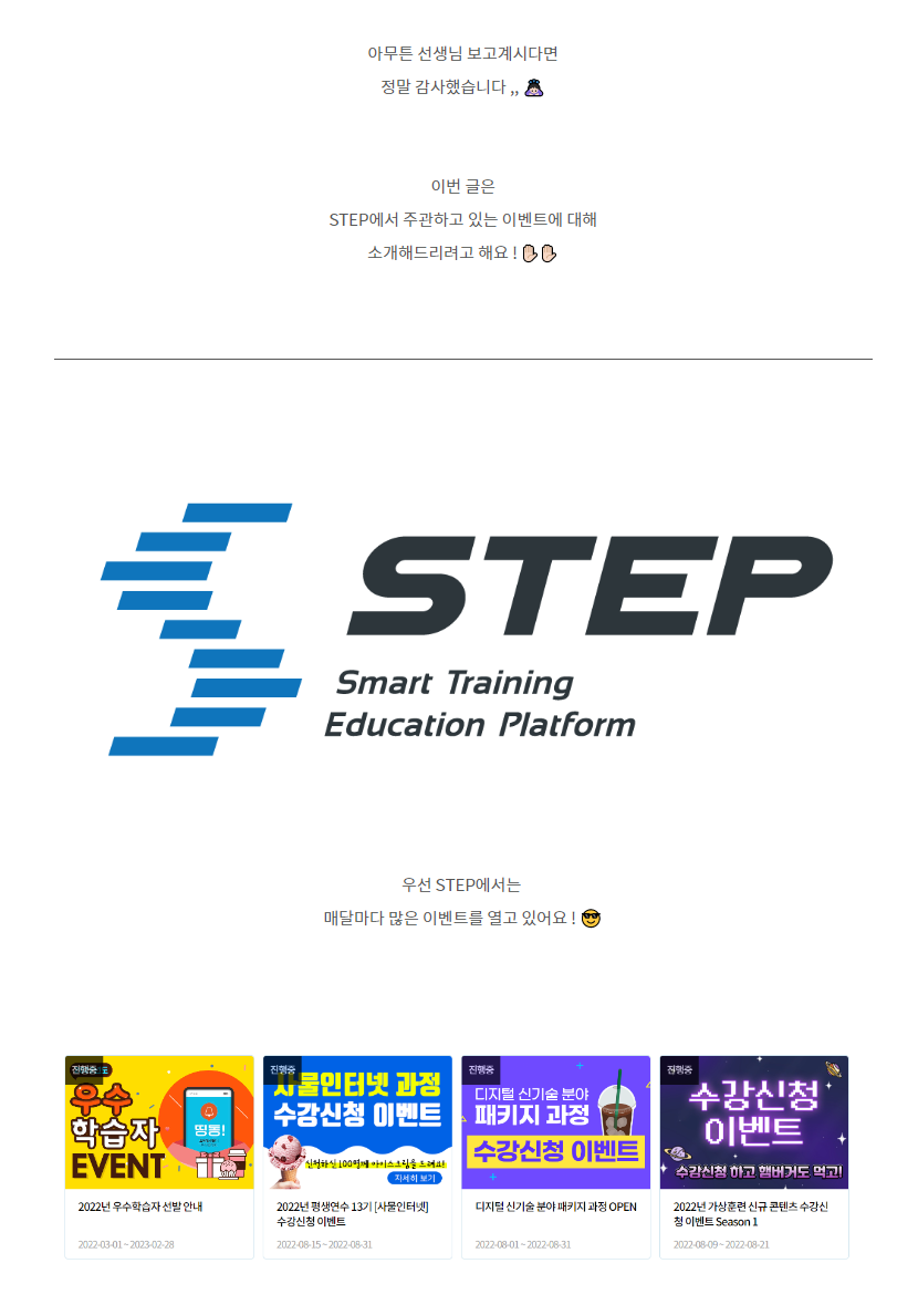 2022.06.30 - [University] - [스마트 직업훈련 플랫폼 STEP] 후기 GOOOOOD ! 다들 극찬하는 기업맞춤연수 실제 후기_txt ( ˘⌣˘ )