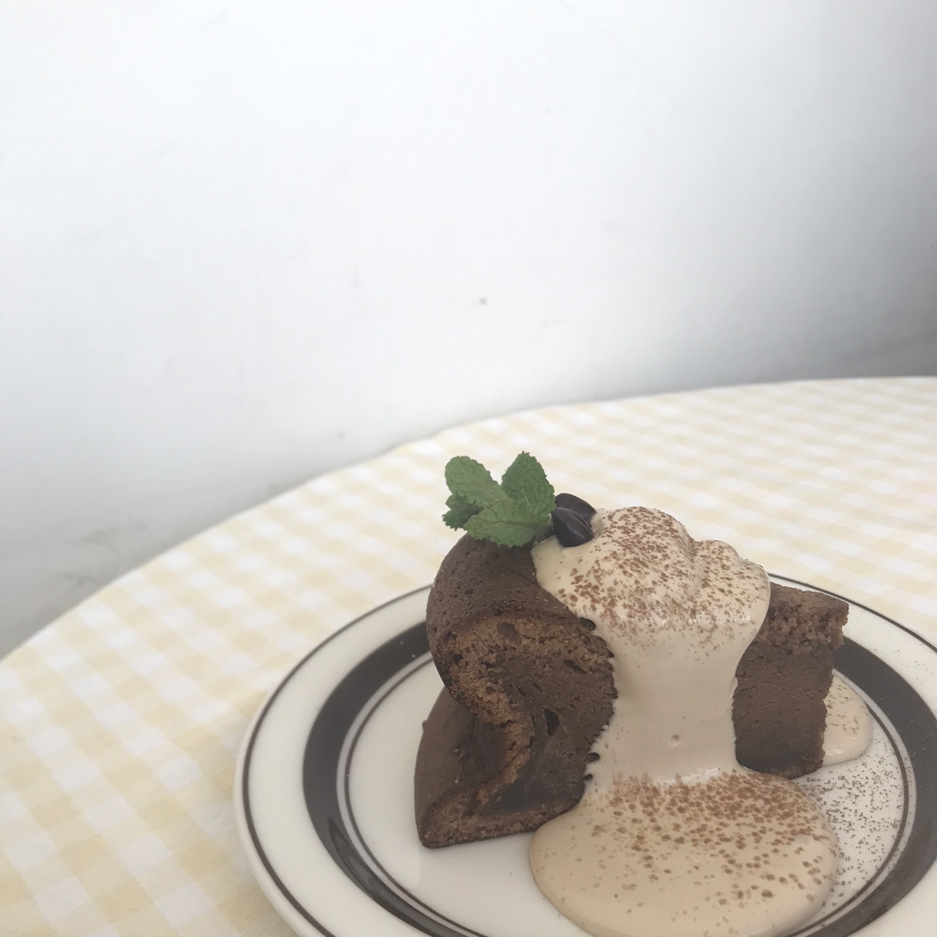 쇼콜라케이크에 커피크림이 올라가있어요.