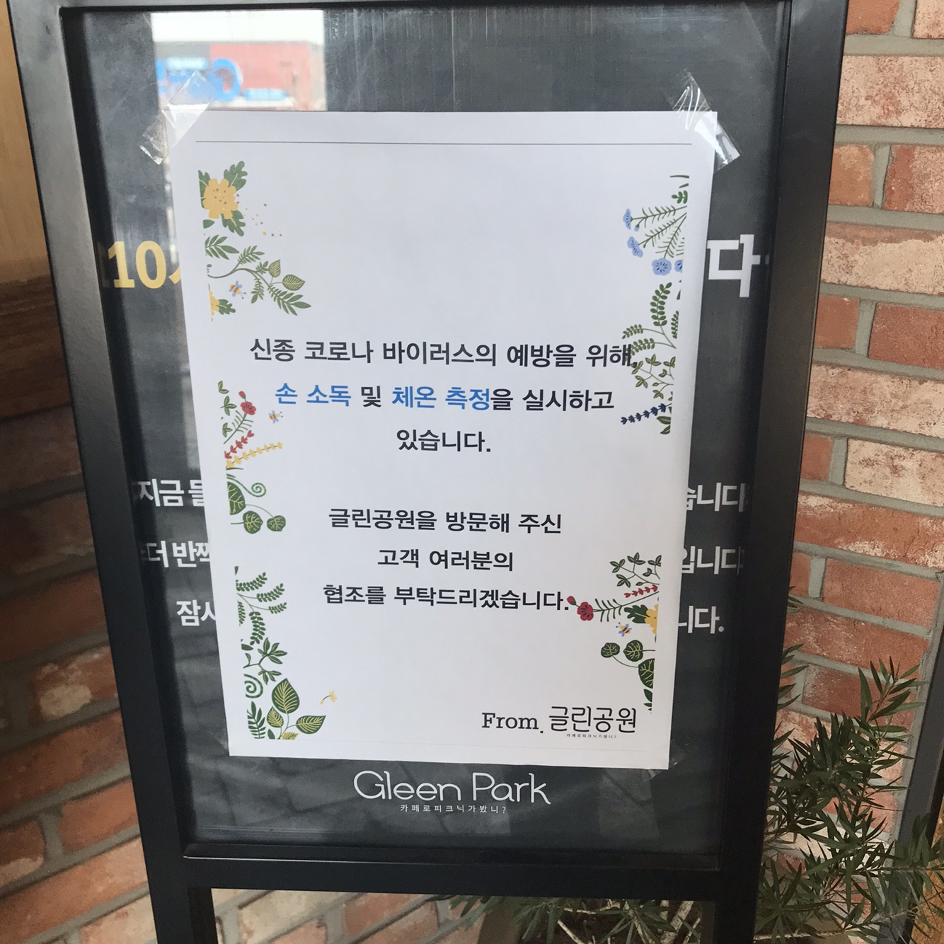 글린공원에 들어가시면 직원분께서 열 체크와, 손소독제를 뿌려주셔요.